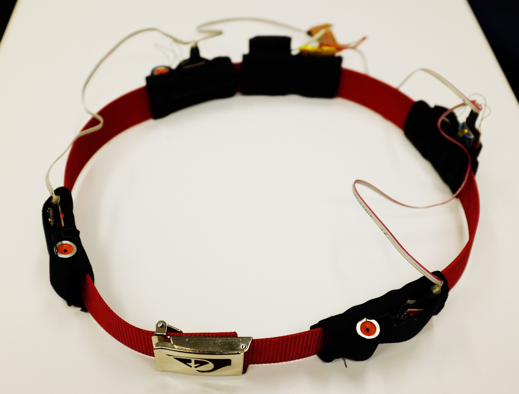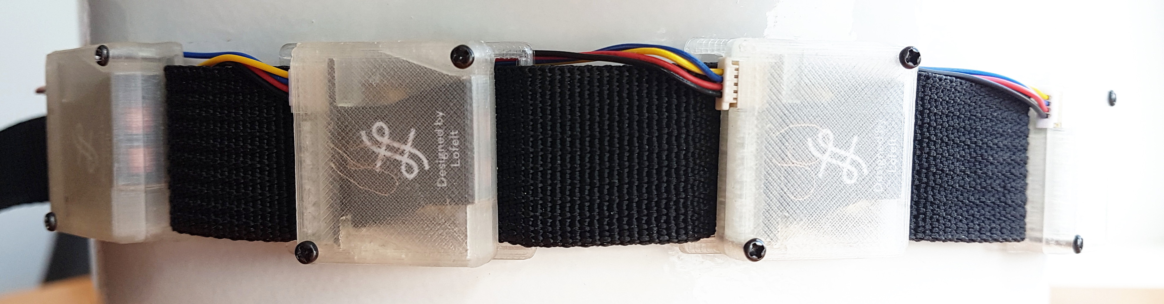 In my Ph.D. thesis at the Shared Reality Lab of McGill University, I investigated vibrotactile feedback systems for balance feedback, specifically a belt for novel feedback mappings, and shoes (described on their own page). The belt combines four state-of-the-art voicecoil actuators and an orientation sensor, forming a test-bed for embedded or external synthesis of novel trunk-tilt feedback.