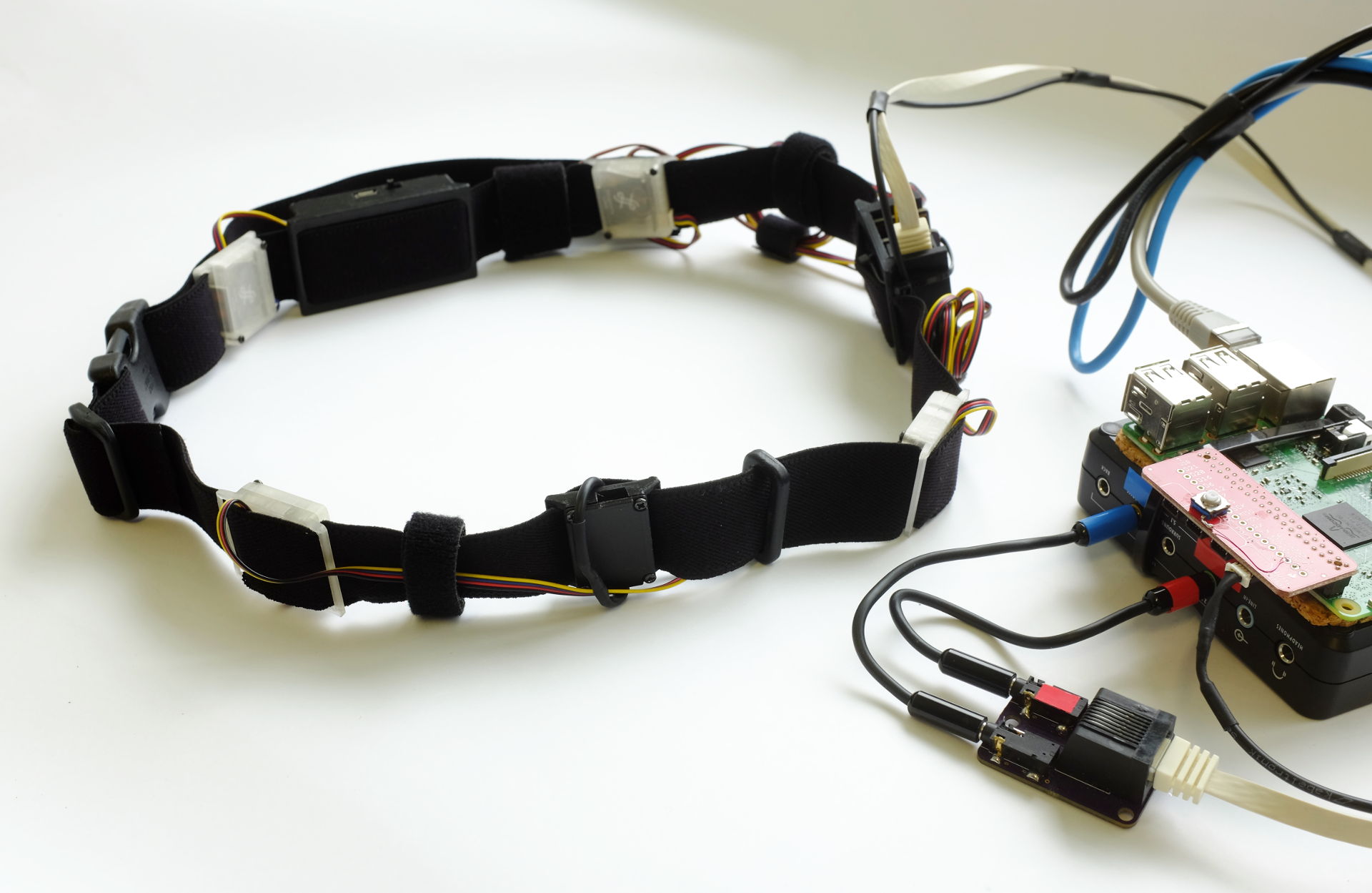 When I began working on this problem, means for embedded synthesis and wide-band tactile actuators (tactors) were scarce. Through three iterations of haptic belts, I worked towards a modular vibrotactile prototyping system for wearables, BRIX5, described on its own page.