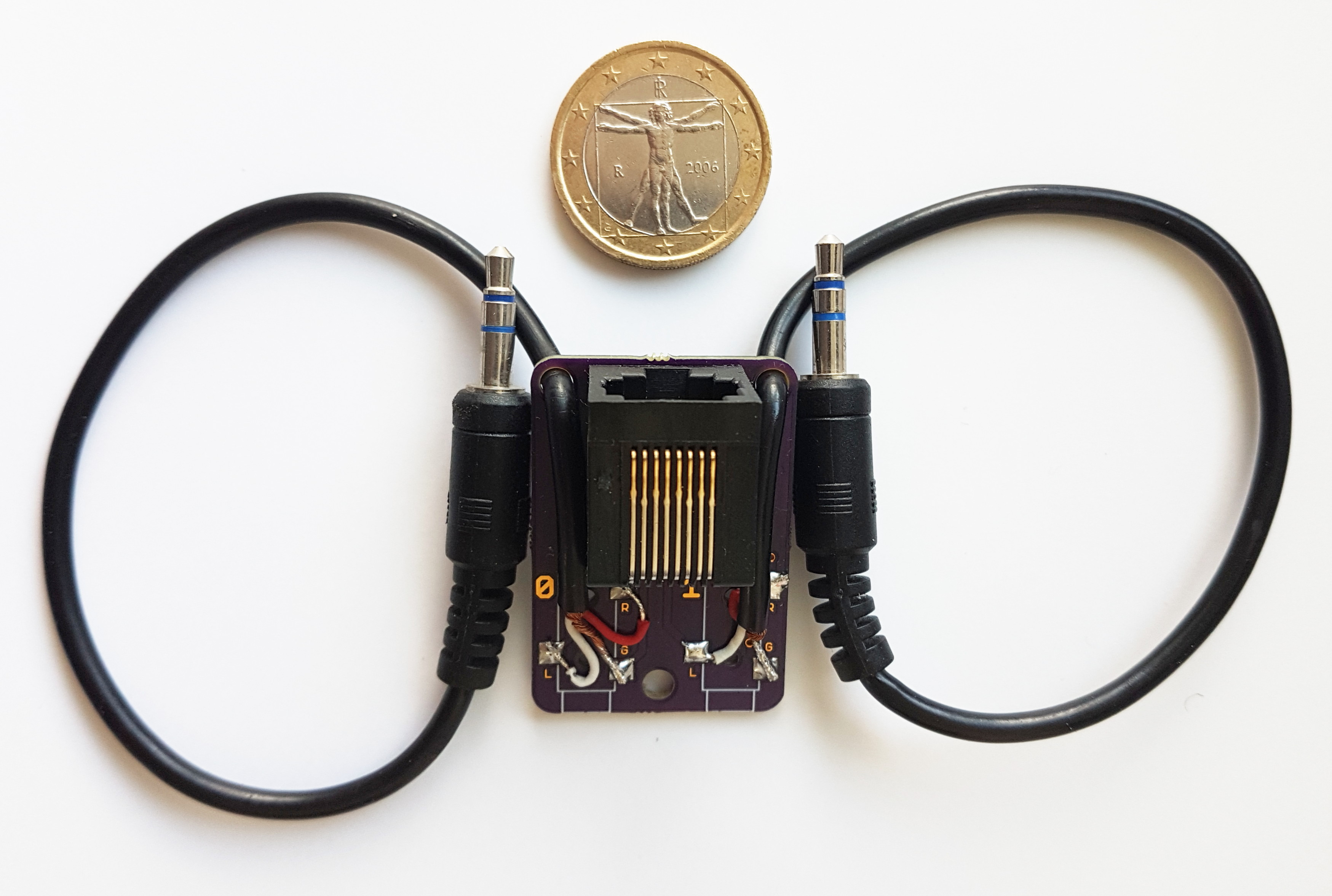 We designed a set of audio adapter boards. These allow rapid switching between tethered (external signal source, e.g., for prototyping) and untethered operation, optionally allowing simple extension by routing four channels of audio/haptic signals through off-the-shelf RJ45 ethernet cabling. A combination of audio adapter, power, and Amp-200 modules provides a modular, functionally equivalent to the Syntacts system hardware.