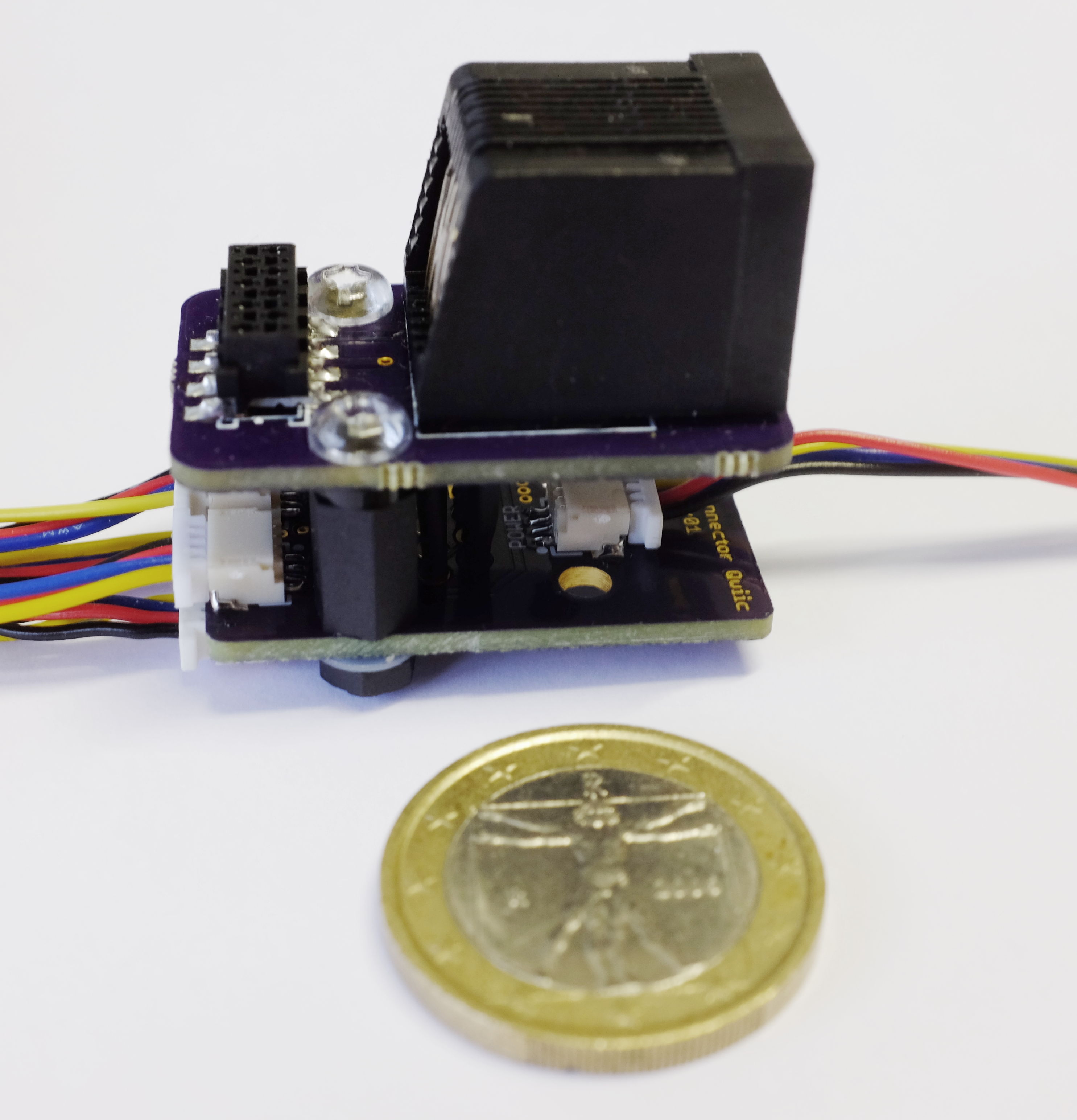 The base module can be extended via a top-mounted Feather wing and through four Qwiic headers on the side, for which a bus power reset circuit allows automated recovery from hangups. Qwiic cables up to 500 mm are readily and cheaply available and can easily be extended with coiled or shielded wire if robustness or length is required, I2C-over-RJ485 and signal-reconditioning modules exist to cover very long distances.