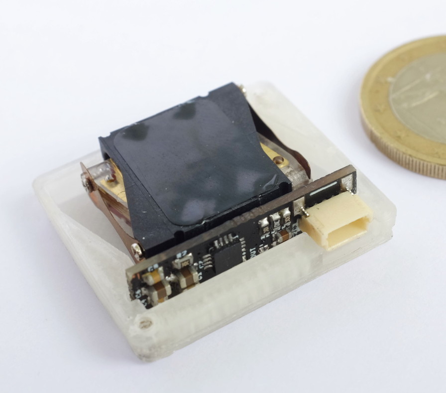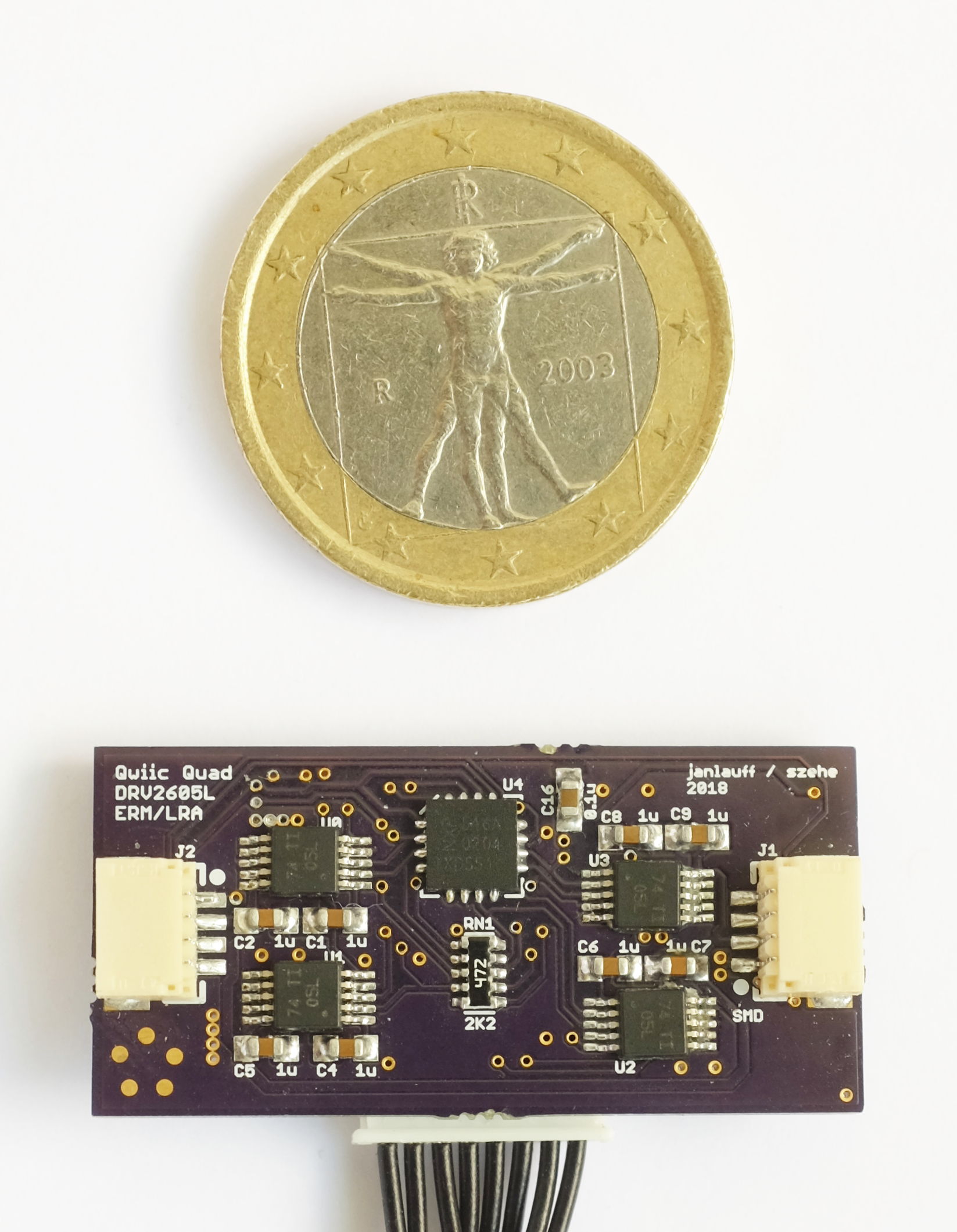 The chosen Bosch BNO055, a 9-axis magnetic, angular rate, and gravity sensor, provides raw and filtered data as well as best-in-class sensor-fusion for absolute orientation estimation. While the base module includes one BNO sensor, we designed miniaturized extensions in two sizes, miniBNO and microBNO for applications requiring additional sensors. The mini-size is suitable for strap-mounting and exposes more chip configuration options. The micro-size is approximately fingernail-sized and meant to be integrated into garments, e.g., glove fingertips, or affixed to the body directly with adhesive tape. For new setups – though our PCB designs accommodates all variants – we use more recent CEVA BNO080/085 variants. These provide orientation output rates up to 400 Hz, allow flexible configuration of input sensors, and exhibit less drift. Through I2C-multiplexers, we have used up to 16 BNOs simultaneously.Multichannel LRA and ERM: QuadDRV