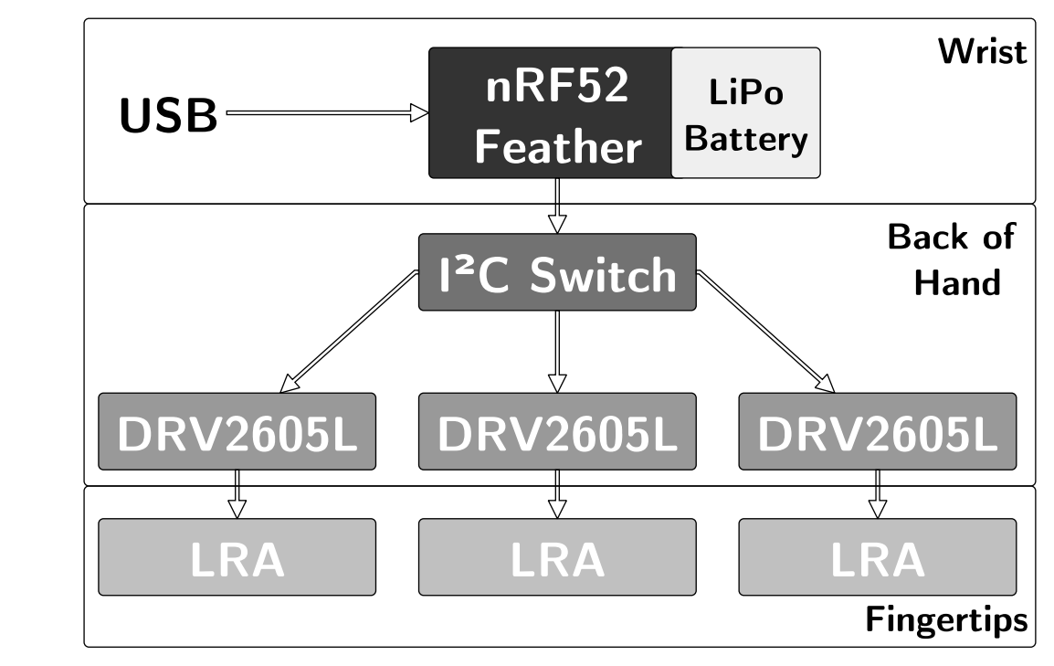 Power supply specification varies with application and number of tactors driven simultaneously. The BRIX5 base module’s Feathers usually supply up to 600 mA; for applications without base module, we designed a standalone power module (up to 800 mA output power. We have also successfully used the Smart Prototyping ZIO Battery LiPo Battery Manager (up to 1.35A).