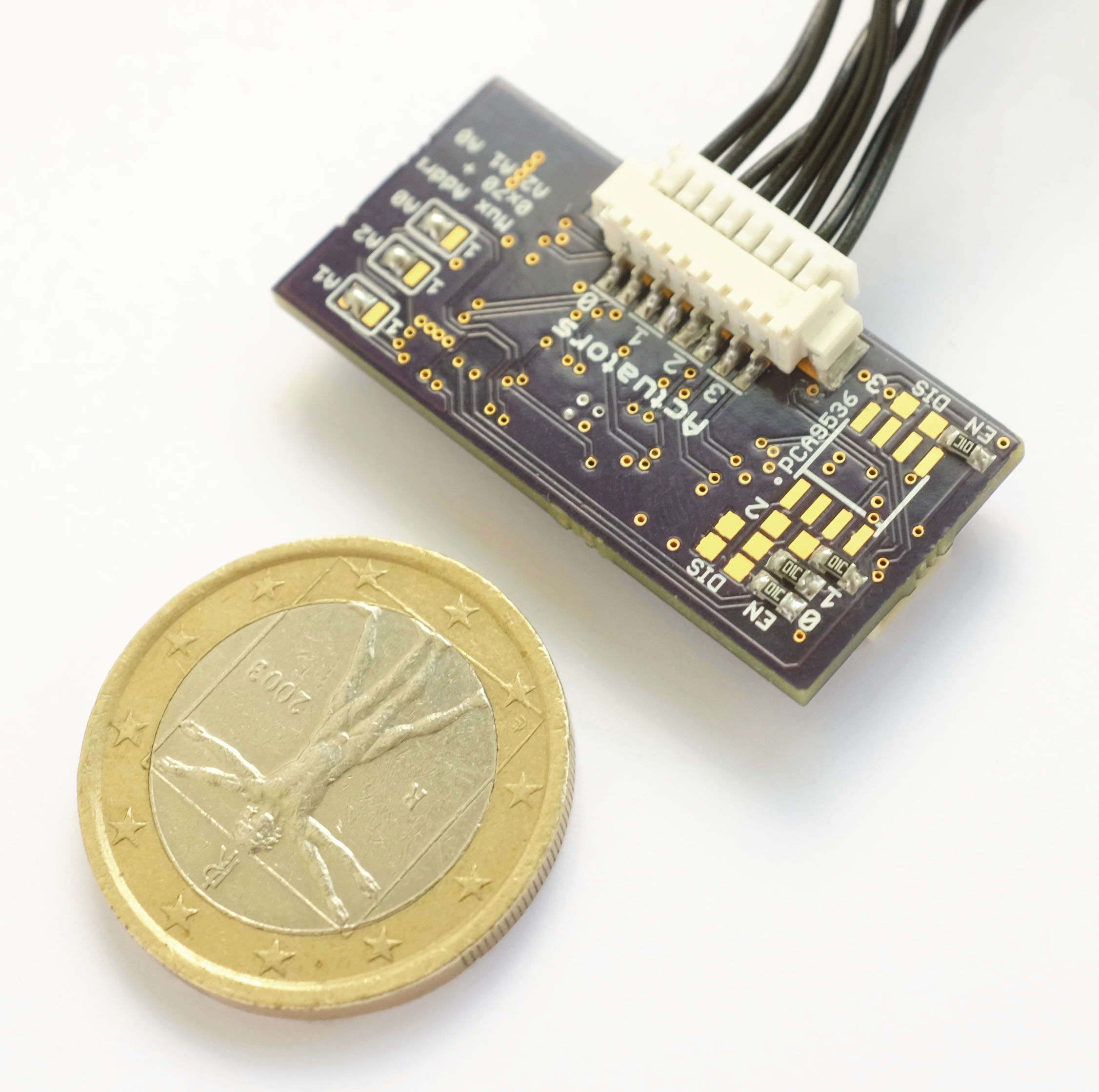 Our QuadDRV extension enables closed-loop control of NBT arrays. To date, most VT wearables to date drive ERMs in an open-loop fashion, which results in slow ramp-up and ramp-down of vibration intensity. The QuadDRV module drives four ERMs or LRAs, and is built around four TI DRV2605L haptic drivers multiplexed by a I2C-bus switch. For ERMs, the DRV2605L allows active braking and overdrive, improving ERM pulse sharpness significantly to a level comparable to that of voice coils. For LRAs, it provides automatic resonance tuning, necessary to derive optimal output amplitude despite resonance frequency varying between tactor samples and with integration. The DRV2605L has a built-in effect library and sequencer and can also operate in streaming mode for external control. Tactors are connected through a 8-pin Molex Picoblade (1.25 mm pitch) plug, chosen for its compact size and the availability of manufacturer-direct pre-made cables.