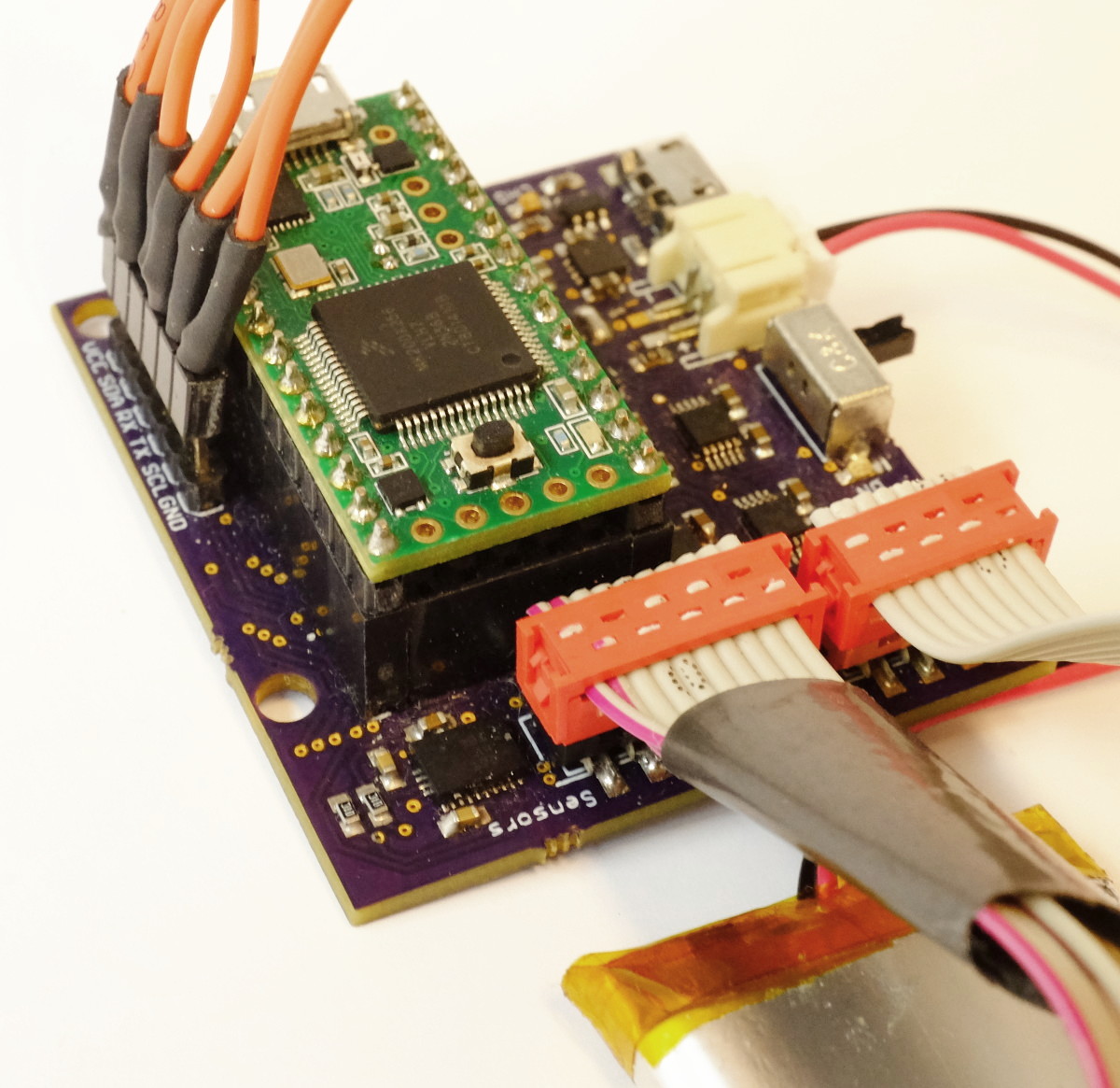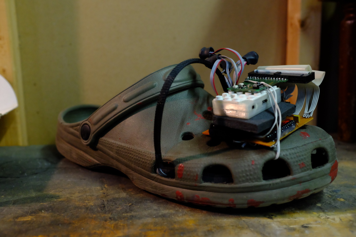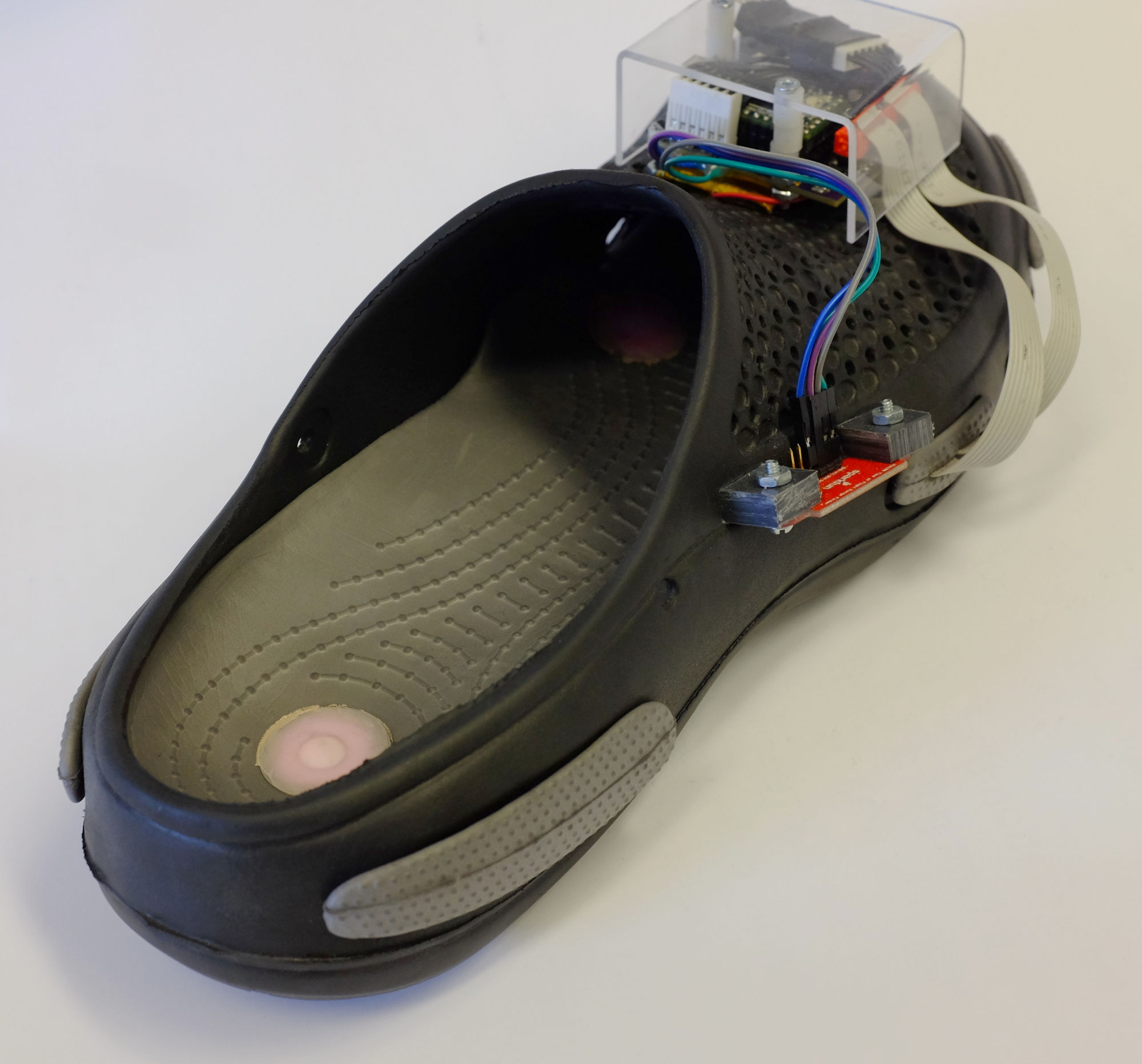 The result was a robust insert based on the concept of a baffle, simliar to a loudspeaker. We also designed a custom PCB for more robust and capable on-shoe electronics, and added sensors: force-sensing resistors under the actuators to measure their loading, and a time-of-flight proximity sensor to measure step height.