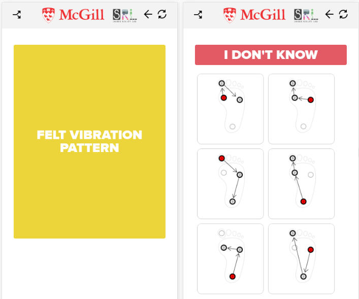 I developed a mobile phone web app, connected to the shoe through Bluetooth Low Energy, controlling tacton delivery, collecting participants responses (see next section), and as general interface to the shoe hardware.