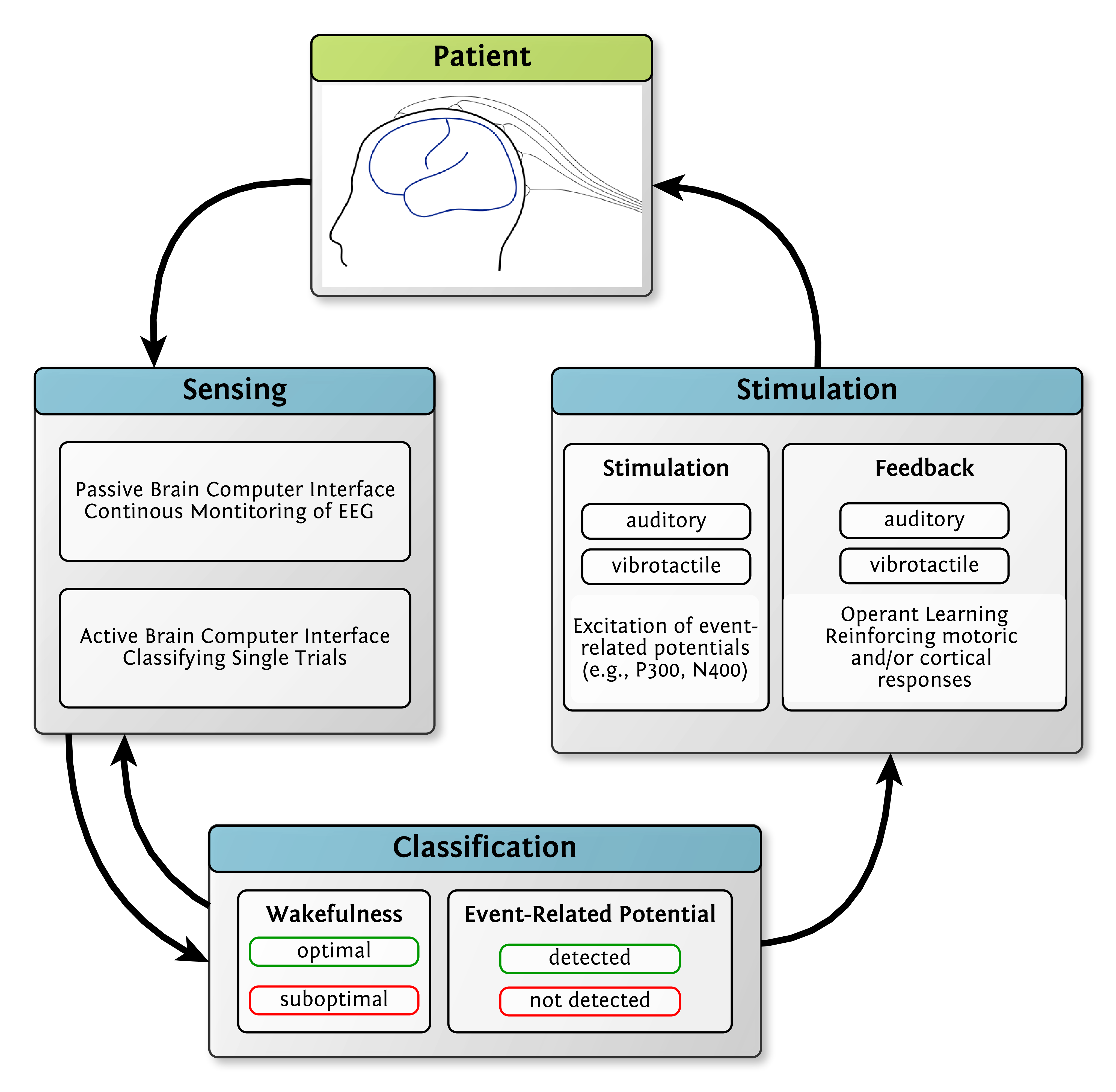 In contrast to existing systems such as Mindbeagle, NCT is based on modular, adaptable wearables, uses individualized BCI machine learning, aims to support both P300-based communication as well as training of residual motor function, and automatically identifies periods of highest patient wakefulness for training.