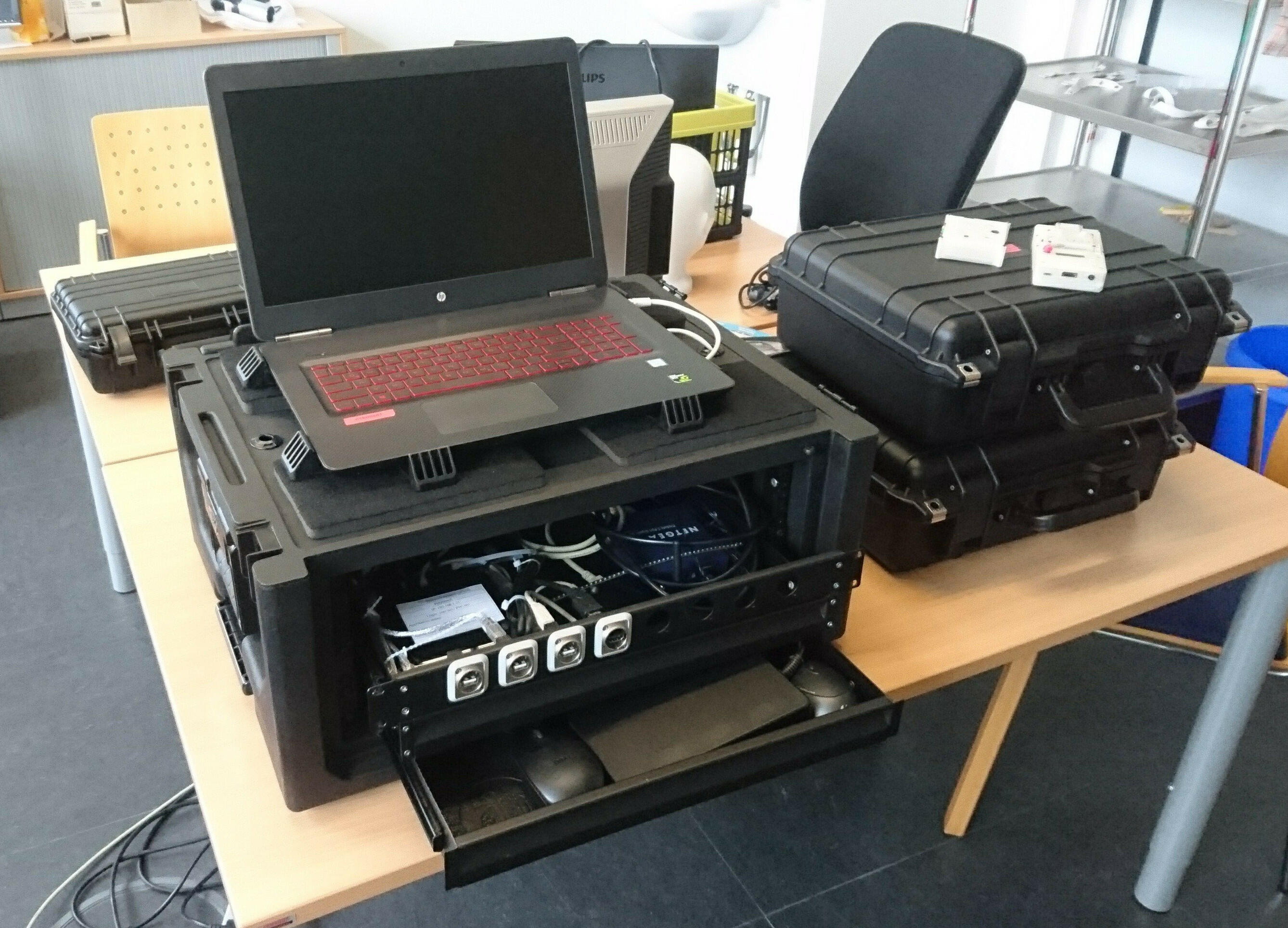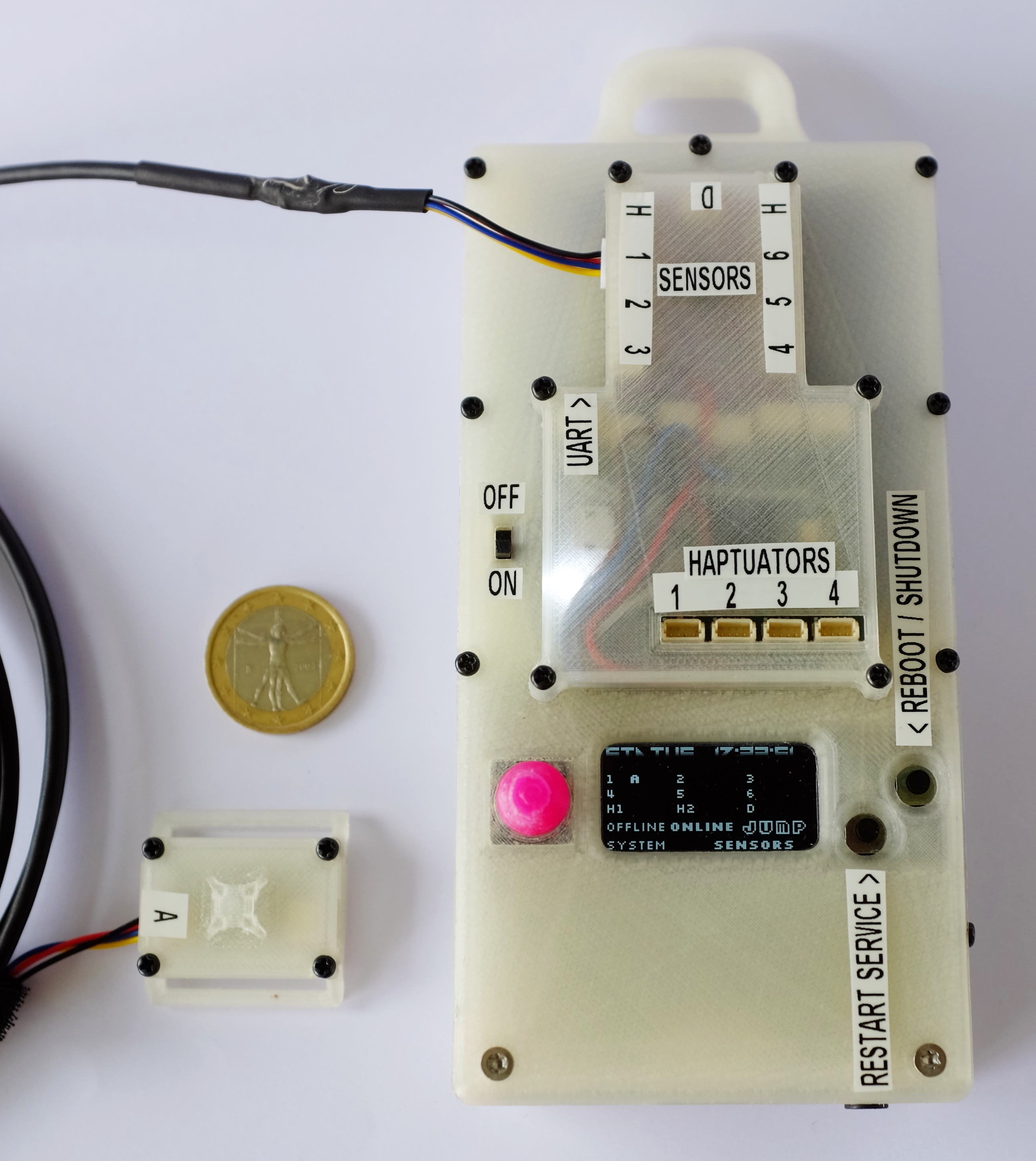 The backbone of the portable system is a controller we call NeuroCore that interfaces between the central BCI controller and sensors/actors. The NeuroCore hangs on the patient bed/seat, and basic functions can be controlled through an display and buttons. Tactile stimuli are either rendered through an integrated Audio-400 module on up to four Lofelt tactors, and/or the VT gloves.