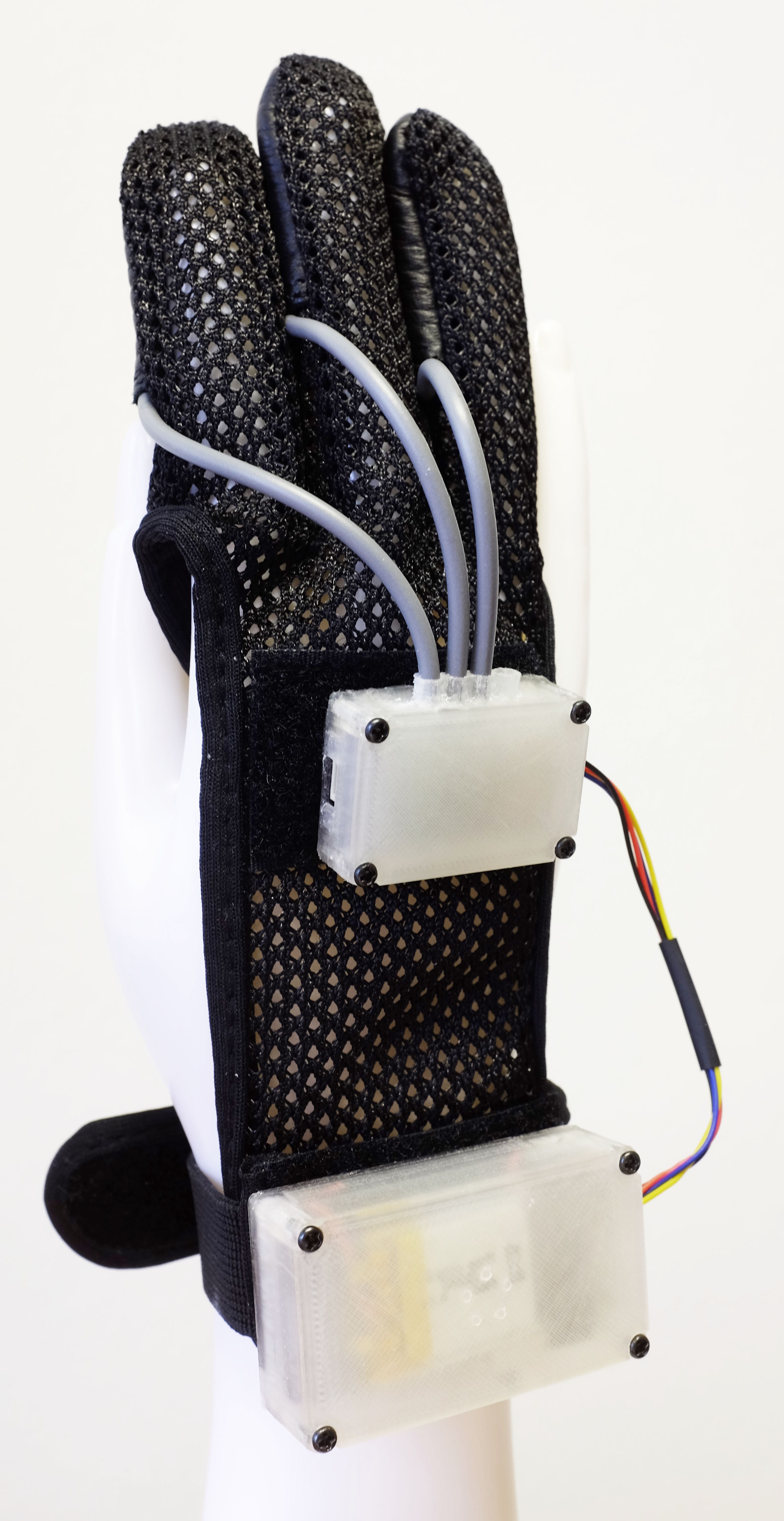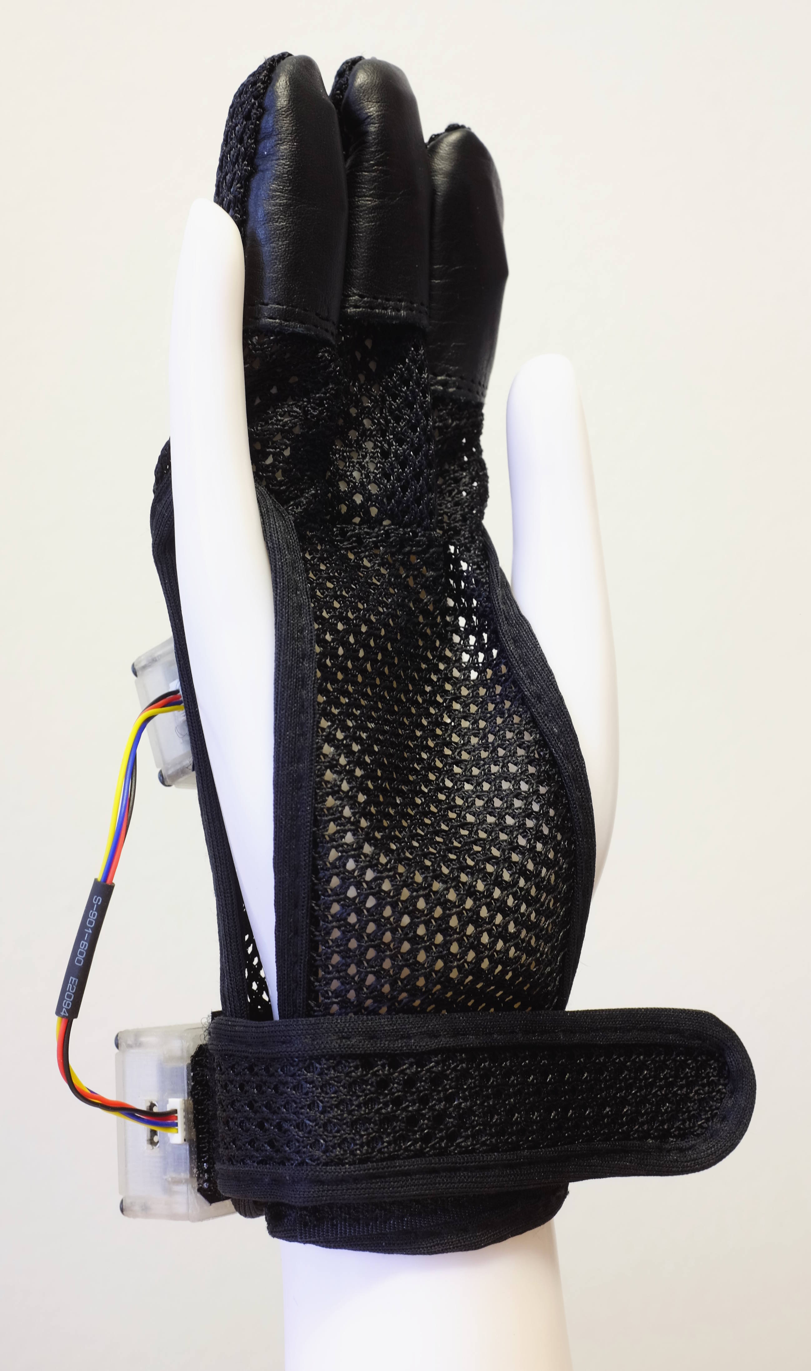 For tactile stimuli rendered to the hands, we developed custom sensor-actuator gloves, based on archery gloves. They fit on varying hand sizes and can be easily donned on subject’s hands by experimenters. Embedded into the index, middle and ring fingertips are LRAs that are controlled by a QuadDRV module attached on the back of the hand. Tubular wire housing physically protects the fragile actuator lead wires.
